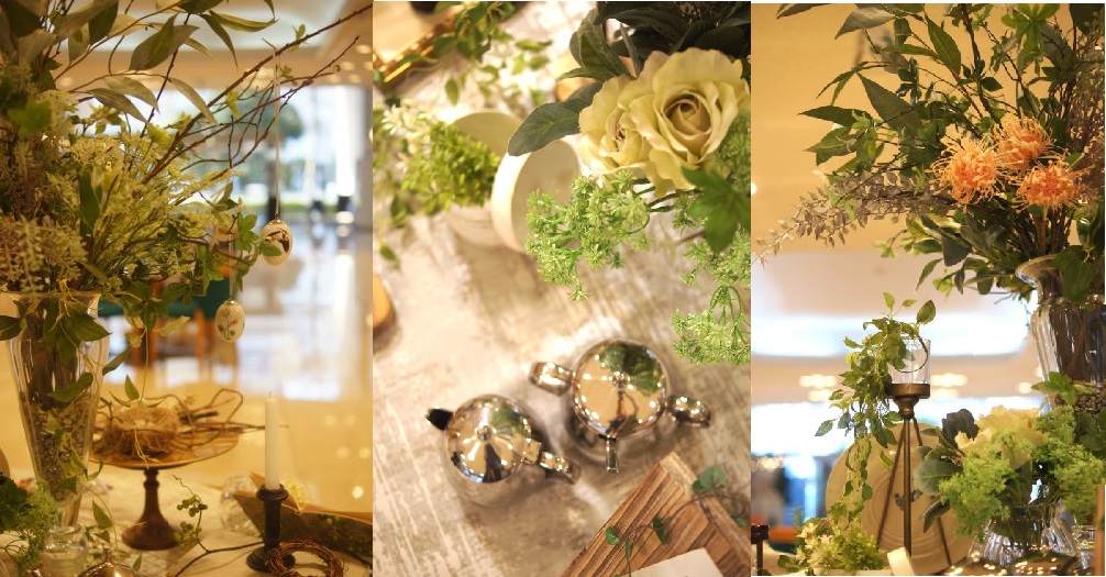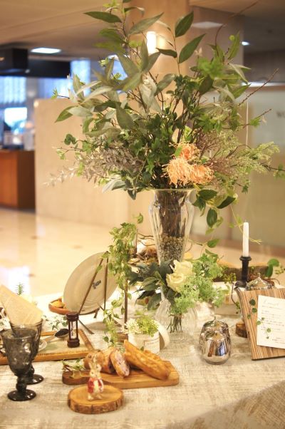 木が芽吹春から初夏までの季節をまたぐ展示でしたので、テーブルを一周すると季節の移り変わりがお楽しみいただけるよう、枝のセレクトからリーフの濃淡まで意識しました。