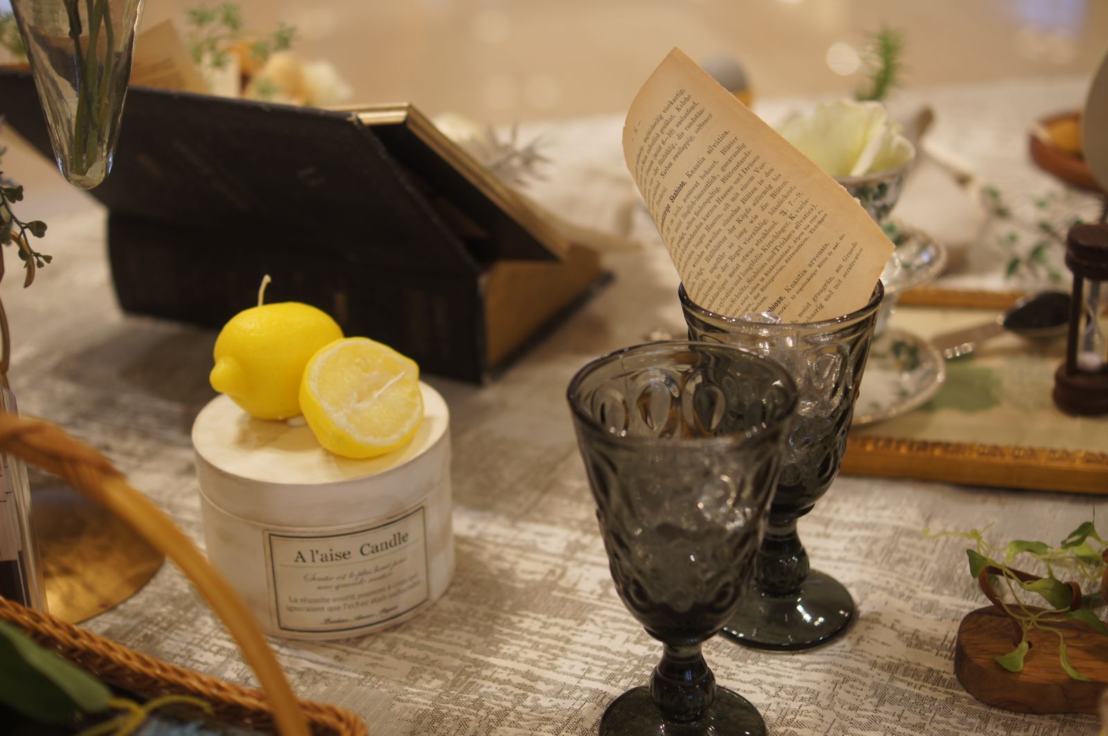 「ティーパーティーの準備の参考に不思議の国のアリスを読んでいたら物語に入り込んでしまった」という隠れたコンセプトを作り、本の中から洋書のページを溢れだしたかのようにディスプレイしテーブル全体にちりばめました。