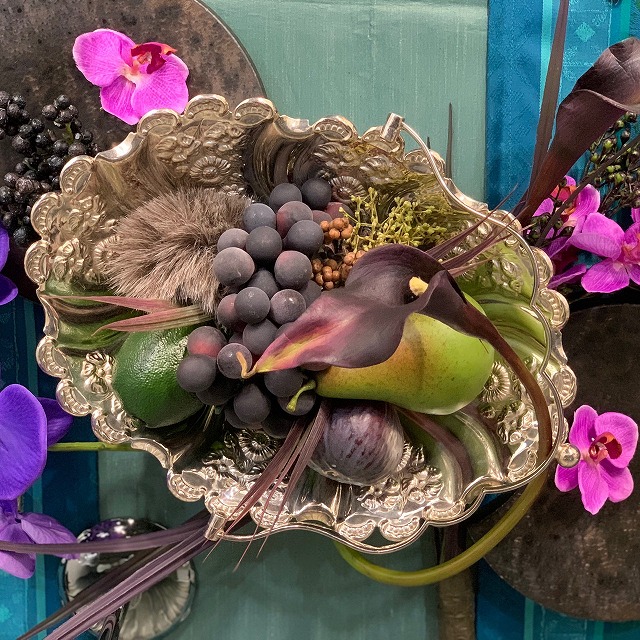 胡蝶蘭とブリッジランナーとの色の掛け合わせで「非日常感」の中での艶やかさと己を超える神秘性を感じるようなカラーコーディネートを意識しました。